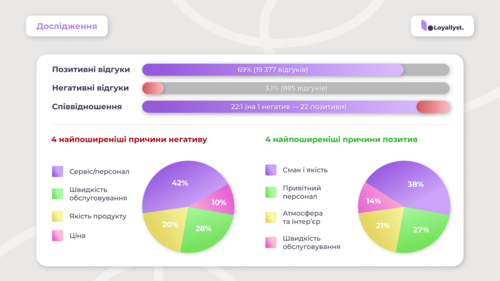 AI-аналіз відгуків показав, що з 28 095 відгуків у 2025 році більшість негативу (42 %) стосувалася сервісу та персоналу, 28 % — швидкості обслуговування, а лише 20 % — якості продукту.