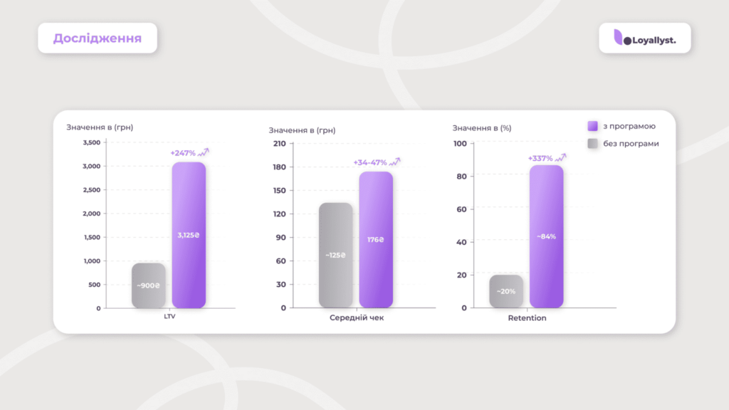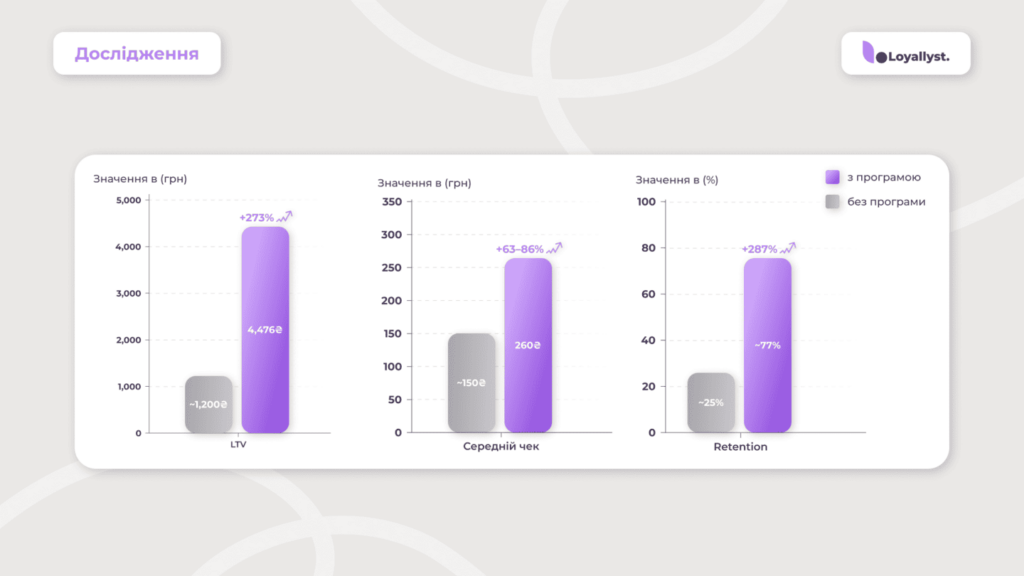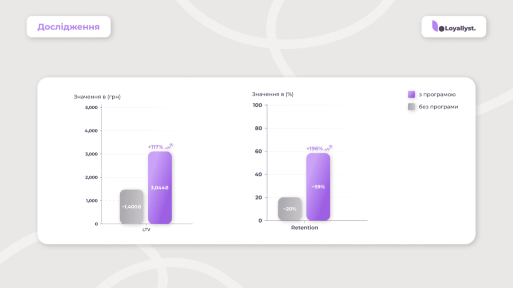 LTV клієнтів з програмою лояльності в середньому на 125 % вищий за базовий, що становить 211 % від LTV без програми (~1 500 грн).