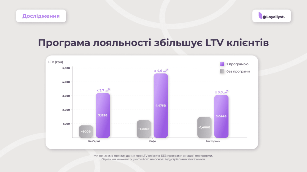 Якщо припустити, що клієнти без програми відвідують заклади в 2–3 рази рідше та витрачають на 30–40 % менше за візит, оцінний LTV становить 900–1 500 грн залежно від сегменту. А отже, програма лояльності збільшує LTV у 2–4 рази. Індустріальні бенчмарки підтверджують ці розрахунки.