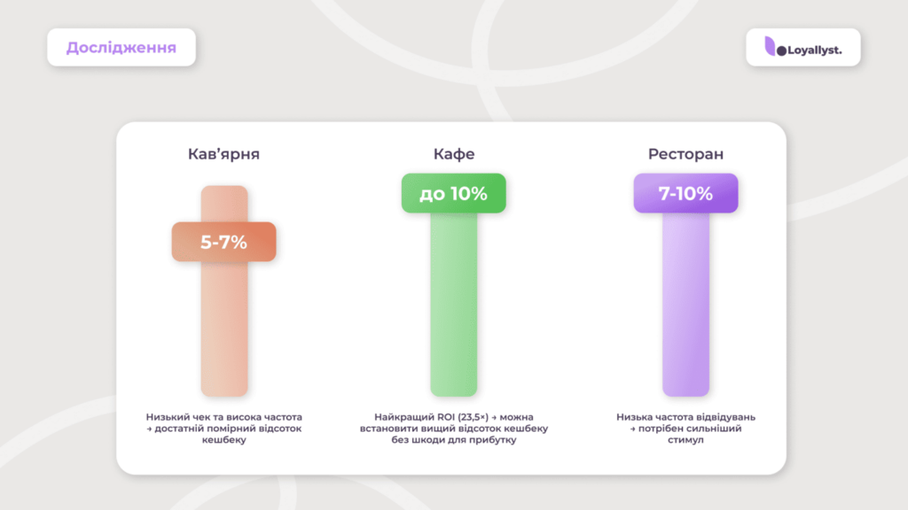 Бізнеси часто питають: «Який відсоток кешбеку встановлювати?» Нижче на графіках показано рекомендовані рівні кешбеку для кав’ярень, кафе та ресторанів із урахуванням частоти візитів, середнього чека та ROI.