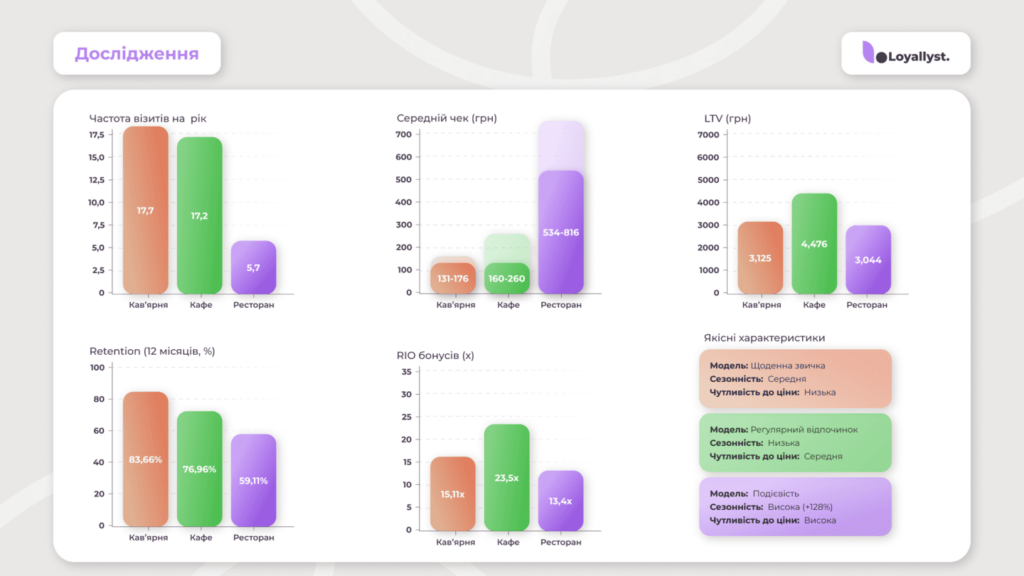 Кафе мають оптимальний баланс середнього чека та частоти візитів. Чек достатньо комфортний для додаткового замовлення (десерт, кава з собою), а частота візитів дозволяє регулярно накопичувати та витрачати бонуси, формуючи звичку повертатися.