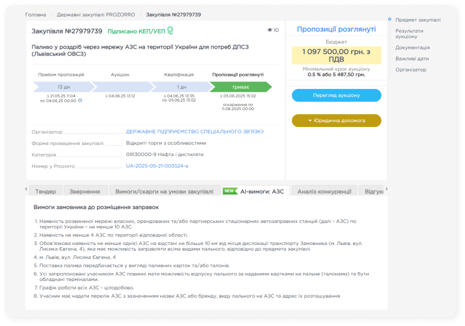Щоб скористатися новим інструментом, потрібно через е-майданчик перейти на сторінку закупівлі та під описом детальної інформації про тендер знайти розділ New «AI-вимоги: АЗС». Додаткові налаштування не потрібні.
